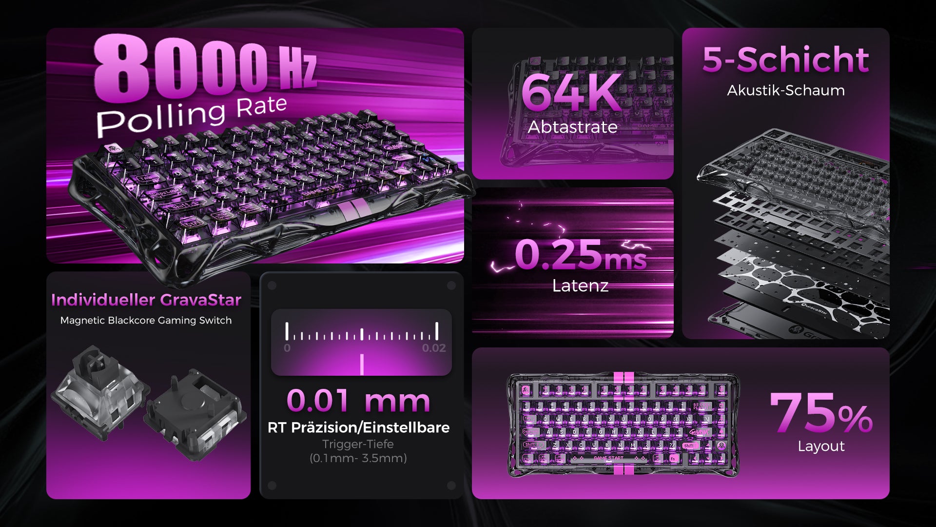 Tastendrucks Präzise Richtungswechsel in Valorant, Apex Legends und Counter-Strike. Intelligente Auflösung gleichzeitiger Tasteneingaben: Tieferer Druck hat Vorrang, flachere Eingaben werden automatisch zurückgesetzt.