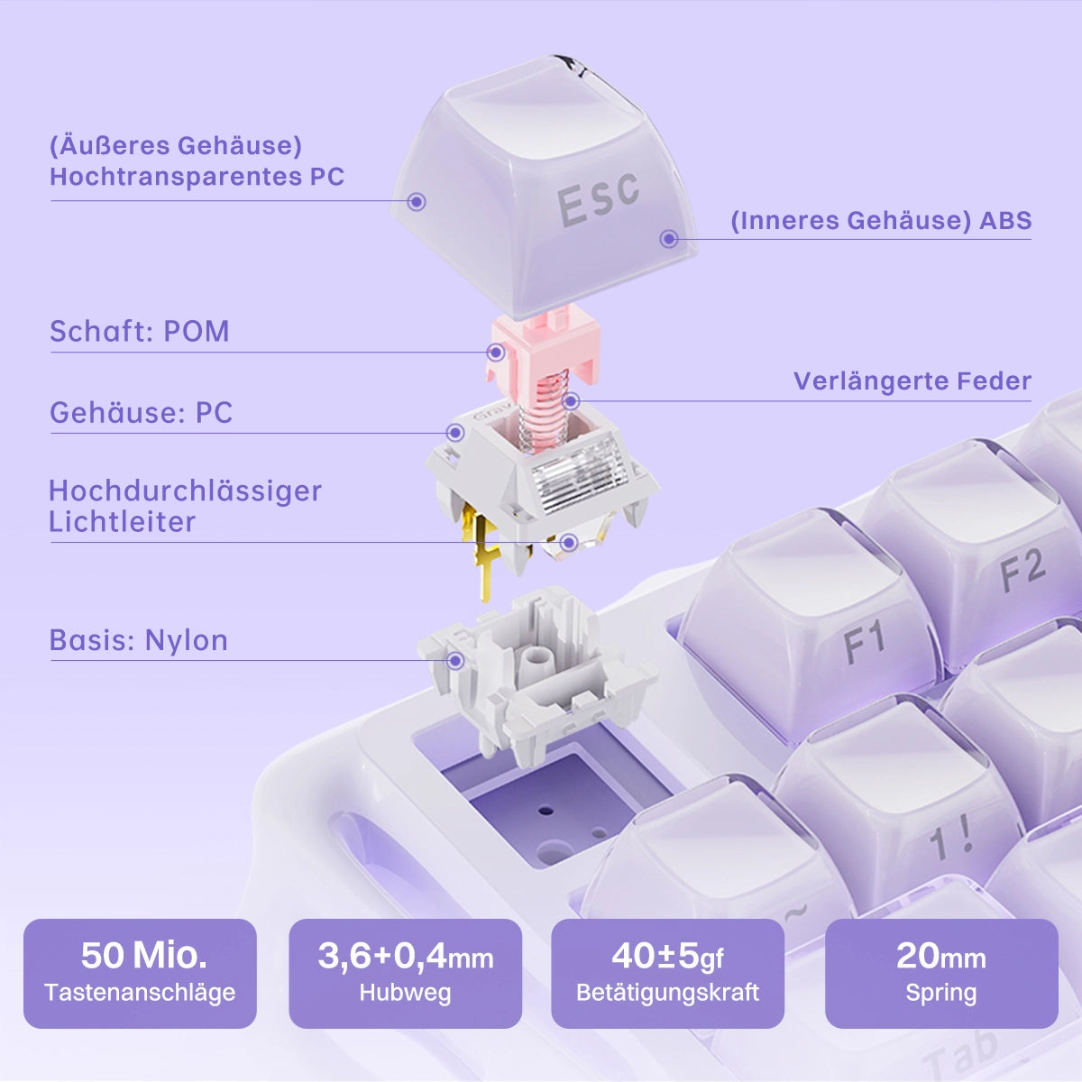 Das Mercury K1 liefert eine verfeinerte akustische Signatur – tiefes, befriedigendes „Thock" bei moderater Lautstärke mit klarem, reaktionsschnellem Feedback. Tauschen Sie Schalter oder Tastenkappen aus, um Ihren perfekten Sound einzustellen. Kein Modding erforderlich.